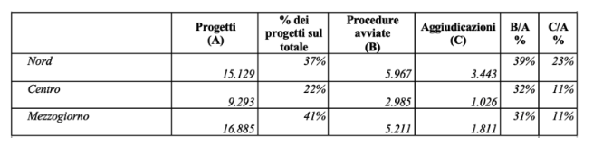 I comuni delle regioni centrali e del Mezzogiorno (tabella 1) hanno avviato un numero inferiore di procedure Pnrr (39 per cento al Nord, 32 per cento al Centro e 31 per cento al Sud) e, soprattutto, ne hanno aggiudicato un numero significativamente inferiore (23 per cento al Nord, 11 per cento al Centro e al Sud).
