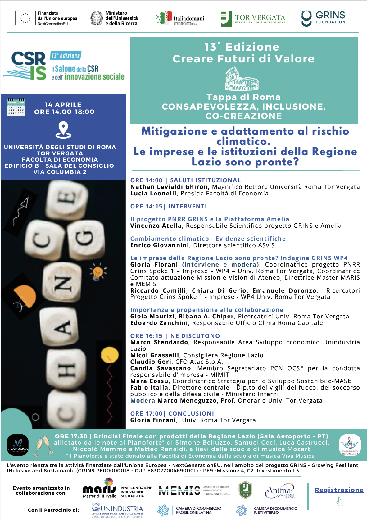 Saranno illustrati i principali risultati emersi dall’indagine rivolta alle imprese, coordinata dalla prof.ssa Fiorani Gloria nell’ambito del progetto Grins (Spoke 1, WP 1.4, Tor Vergata) e volta ad approfondire le strategie di mitigazione e adattamento al rischio climatico nel contesto imprenditoriale della Regione Lazio.