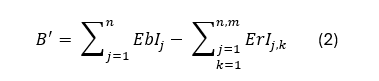 Dove: B′ è il bilancio ambientale annuo del distretto; EbIj è il contributo annualizzato dell’indicatore ambientale per lo scenario pre-riqualificazione (per ogni categoria di impatto j); ErIj,k è il contributo annualizzato degli interventi di riqualificazione k (per tutte le categorie j).