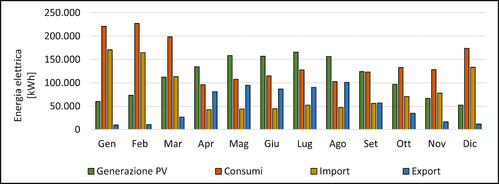 Su base annua, tuttavia, la sola installazione dei pannelli fotovoltaici in copertura non garantisce l’autosufficienza energetica, pur a fronte di una domanda sensibilmente ridotta. Tramite la completa elettrificazione del distretto, l’adozione di tecnologie ad alta efficienza e l’integrazione di fonti rinnovabili, è possibile coprire con generazione locale fino all’80% della domanda energetica complessiva.