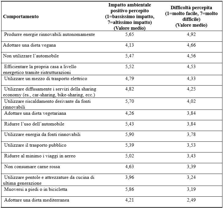 L’altra domanda, invece, riguardava la difficoltà percepita del mettere in pratica lo specifico comportamento (“Indichi quanto è difficile, secondo Lei, mettere in atto ciascuno dei seguenti comportamenti nella vita quotidiana”), con le risposte registrate su una scala da 1 a 7 (1 = molto facile, 7 = molto difficile). La Tabella 1 riporta i sedici comportamenti, presentati in ordine decrescente di livello di difficoltà percepita, con il relativo impatto positivo percepito.