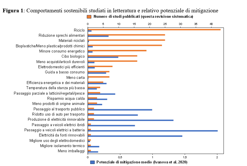 Contrariamente a quanto ci si aspetterebbe sul piano logico, gli studiosi si sono focalizzati su come promuovere comportamenti (ad esempio, riciclare i rifiuti, ridurre lo spreco di cibo) il cui contributo effettivo in termini di emissioni di CO2 risparmiate si è dimostrato limitato, trascurando l’analisi di altri comportamenti decisamente più impattanti (ad esempio, utilizzare un mezzo di trasporto elettrico, vivere senza automobile, efficientare la propria casa a livello energetico tramite ristrutturazioni, seguire una dieta vegana).
