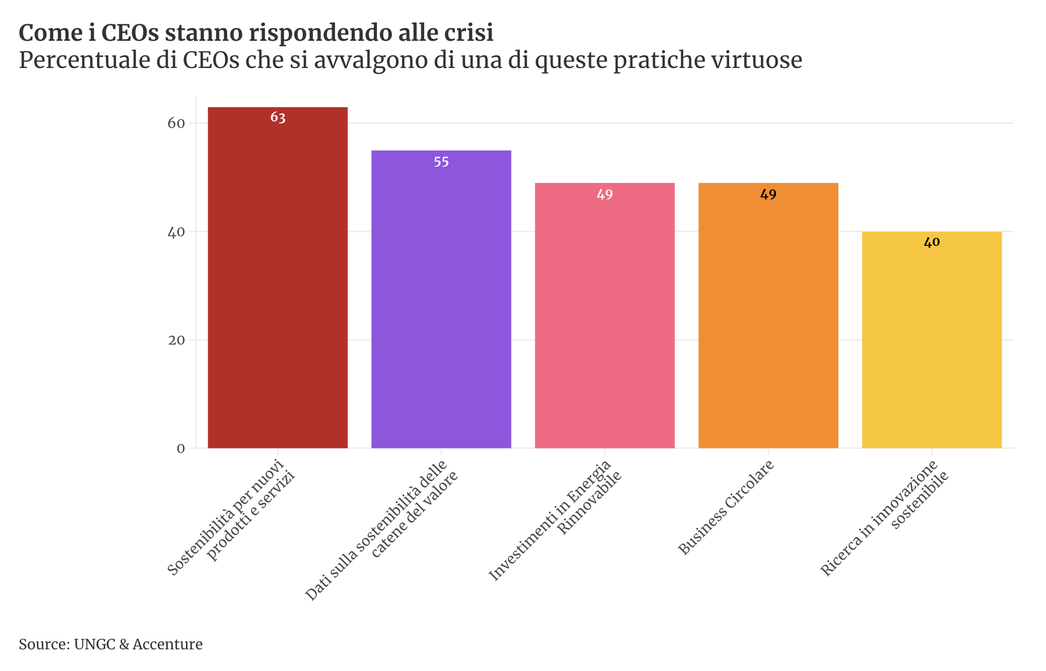 Anche i CEO sono convinti che la sostenibilità sia un elemento importante. Secondo il CEO Study delle Nazioni Unite e la società di consulenza Accenture, per quanto la maggioranza degli Amministratori Delegati sia preoccupato che le sfide poste dallo scenario economico potranno mettere a repentaglio il raggiungimento degli Obiettivi di Sviluppo Sostenibile, c’è ormai un accordo unanime sulla centralità della sostenibilità per lo svolgimento delle loro attività, quindici punti percentuali in più rispetto a dieci anni prima. Non solo: i CEO intervistati notano come maggior investimenti in tecnologia possano rappresentare una risposta agli shock - quello sanitario, quello sulla catena del valore, quello dovuto alle tensioni geopolitiche, quello inflazionistico.