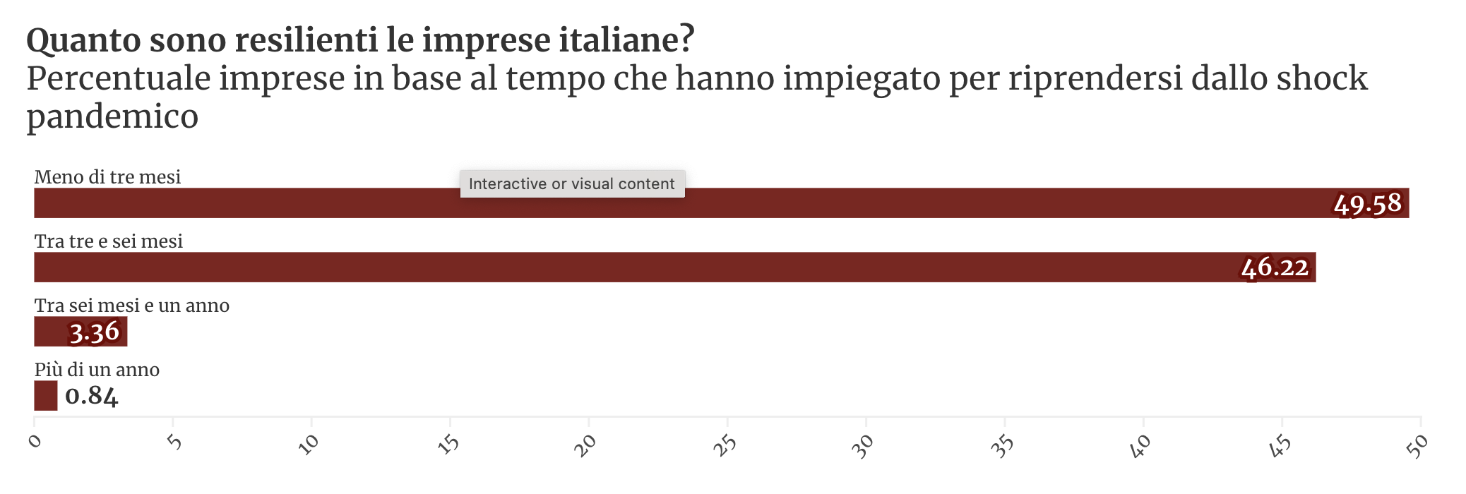 Come prima cosa, è utile avere un quadro della stima fatta dai ricercatori e dalle ricercatrici di qual è il tempo di ripresa per un’impresa dopo una perturbazione come quella avvenuta con la pandemia e le relative misure di contenimento. L’analisi svolta rileva come quasi la metà delle imprese considerate impiegherebbe meno di tre mesi per riprendere l’attività economica sullo stesso trend precedente all’evento pandemico, mentre il restante è concentrato nella fascia temporale tre e sei mesi. Meno del cinque percento delle imprese impiegherebbe oltre sei mesi per riprendersi. Questi risultati indicano una buona capacità delle aziende italiane di rispondere in modo rapido a crisi impreviste.
