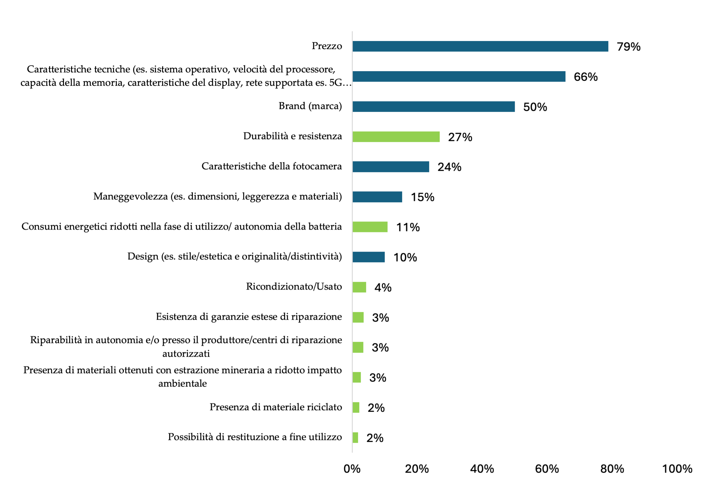 Quando si guarda più nello specifico agli attributi a cui si è data priorità nell’acquisto dell’ultimo telefonino, emerge con forza la potenza del prezzo come driver di scelta: ben il 79% del campione lo mette, infatti, nelle prime tre posizioni.