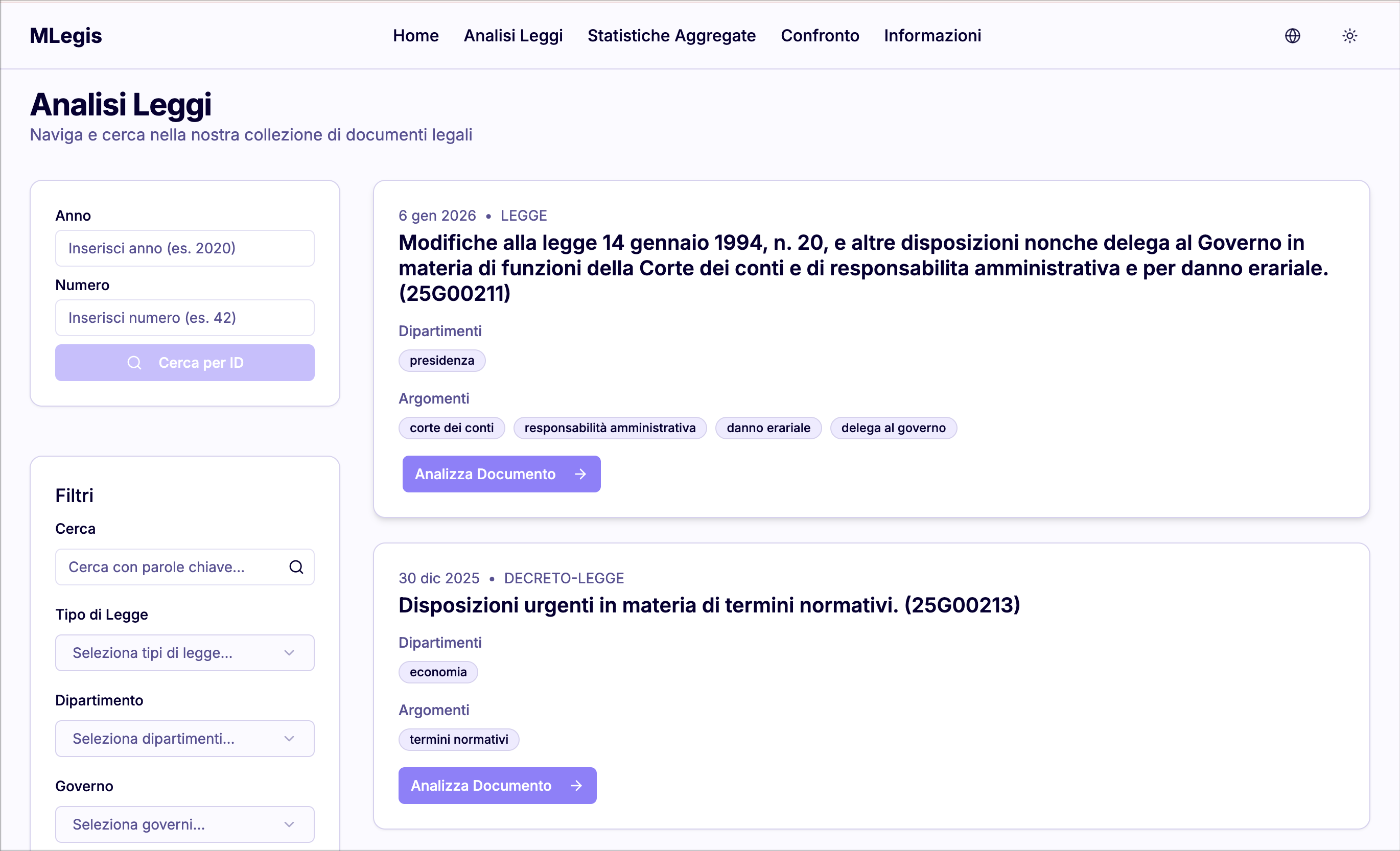 La piattaforma si basa sull’analisi testuale completa dell’intera legislazione italiana, includendo tutte le leggi emanate dal 1948 a oggi, per un totale di circa 70.000 testi normativi e oltre 90 milioni di parole. L’archivio è costantemente aggiornato con i nuovi atti pubblicati in Gazzetta Ufficiale, rendendo MLegis uno strumento dinamico e sempre allineato alla produzione normativa più recente. L’applicativo è accessibile via web e consente una consultazione intuitiva, affiancata da indicatori quantitativi di complessità e qualità redazionale.