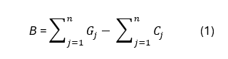 Dove: B è il bilancio energetico annuo del distretto (in energia finale); Gj è l’energia prodotta, su base oraria, dai pannelli fotovoltaici in copertura (j = 1–8760); Cj è l’energia oraria consumata all’interno del distretto (j = 1–8760).